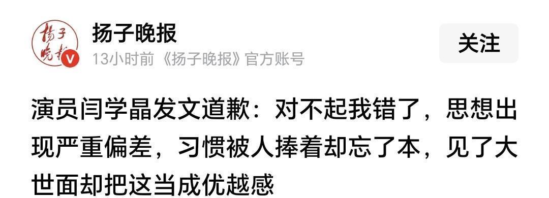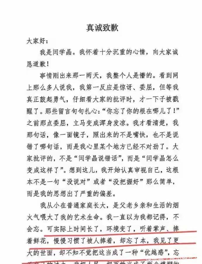 闫学晶道歉救不了事业,狂妄言论引众怒,豪宅哭穷谁买单?2026日晚,闫学晶终于在朋友圈发了一篇长文道歉。这位靠《刘老根》里山杏一角火遍大江南北的老戏骨,因为一句“儿子拍戏年入几百八十万还不够花”彻底翻车。事情发酵半个月,代言被砍、账号受限,现在总算想起来低头认错了,但能不能重新赢回人心,真不好说。